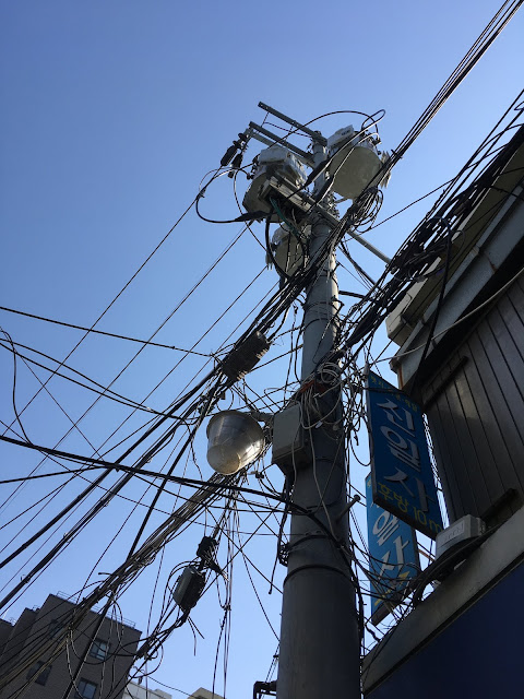 I wanted to start with something that I don't dislike even though it's far from beautiful (not to say plain ugly): wires. There are a lot of overhead power lines in Korea. Actually, I don't know if it's electric cables or telephone wires. What I do know is that in some places, all these wires are VERY messy. But it's no without a certain charm, I would even say there's something hypnotic about them. And it's quite unfamiliar to me, coming from a country where most lines are subterranean. It seems that old lines are now being replaced with newer and neater yellow lines. I've seen more and more of these lately. And I have now idea why they're yellow... Anyways, maybe this topic will get a full post on this blog soon, because I'm realizing I have a lot to say, and a lot of pictures to post about them.